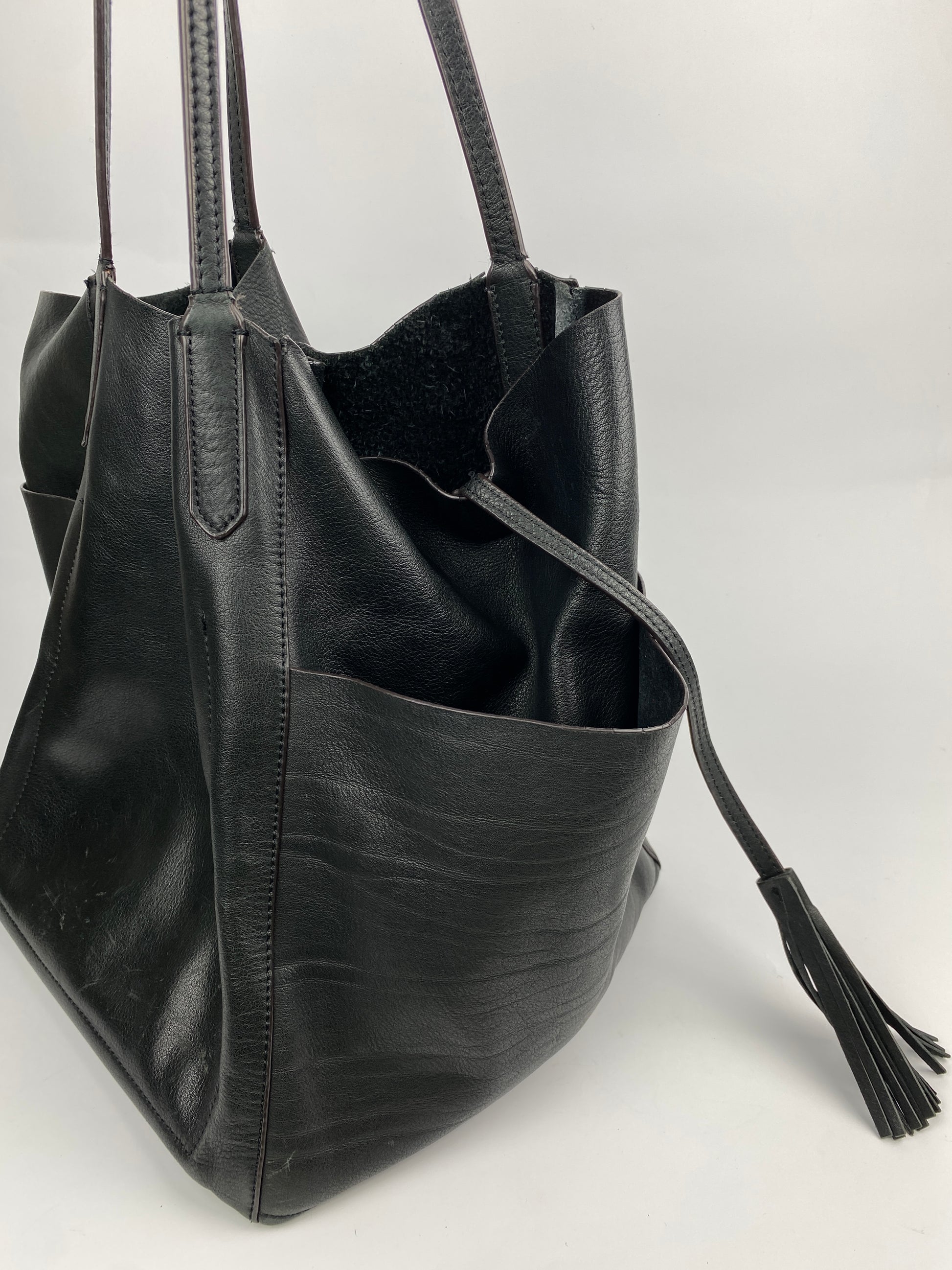 Large black leather tote with a soft, unstructured shape. Two handles, side pockets, and tassel details. Includes a detachable interior pouch.