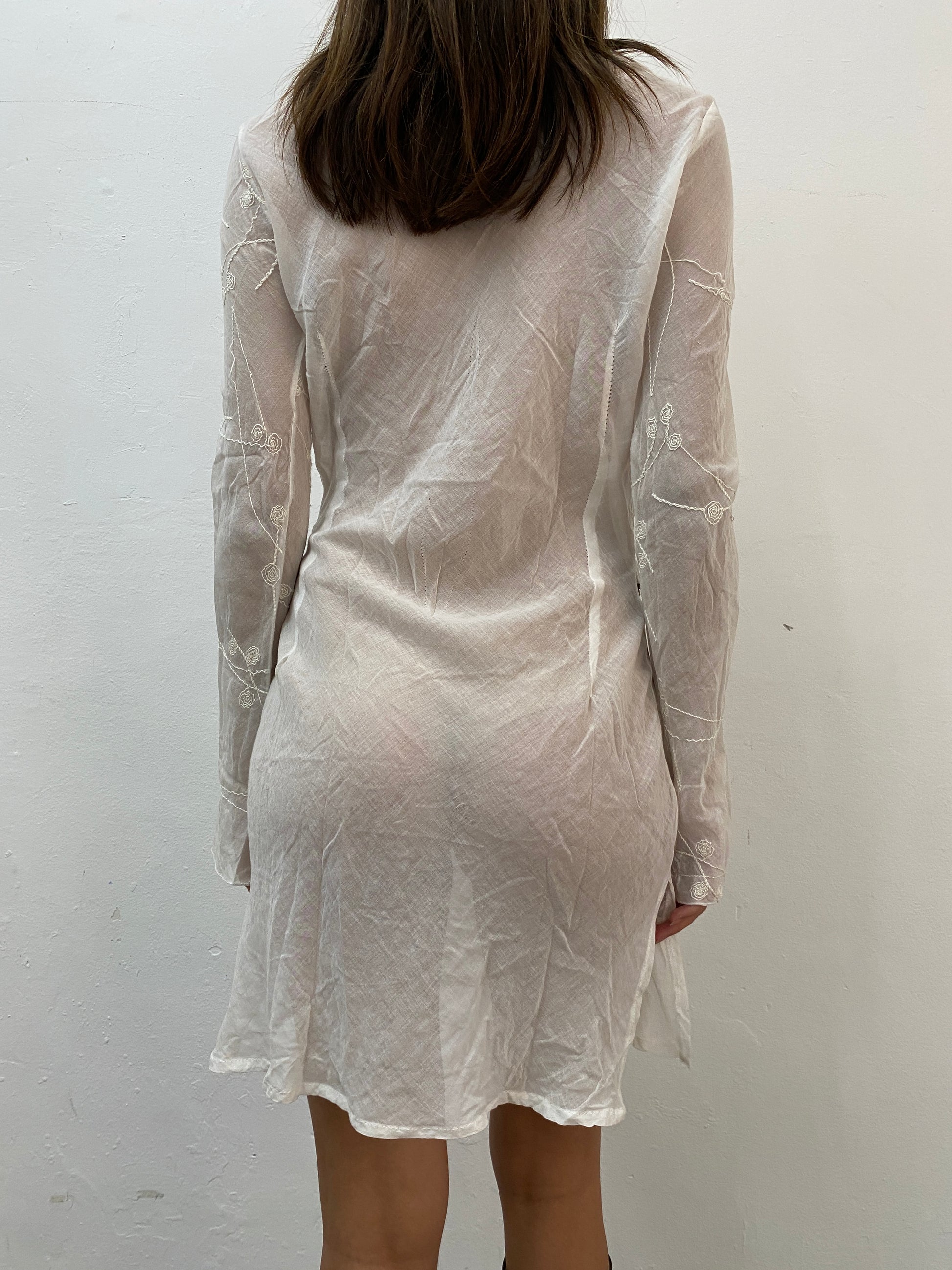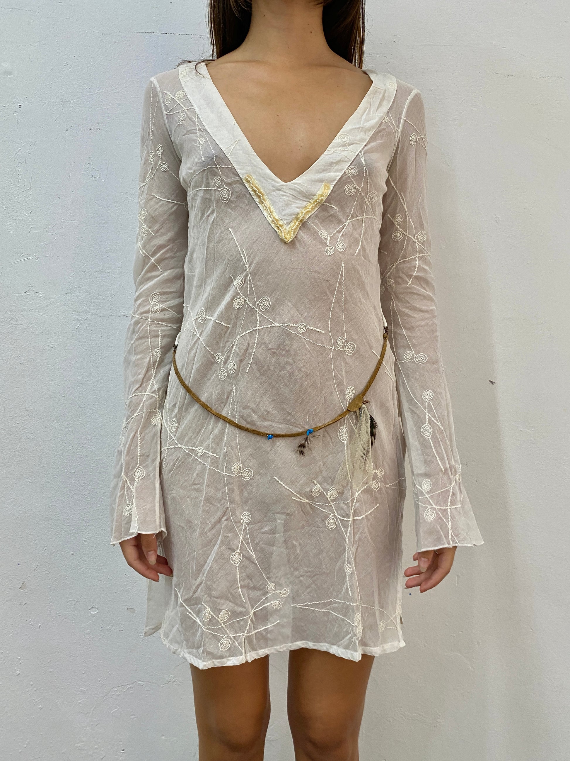 Italian designer lightweight and semi-sheer dress features delicate floral embroidery, flared sleeves, and a soft V neckline. Finished with a fine suede belt adorned with tulle, feathers, and blue beads for a subtle bohemian touch.