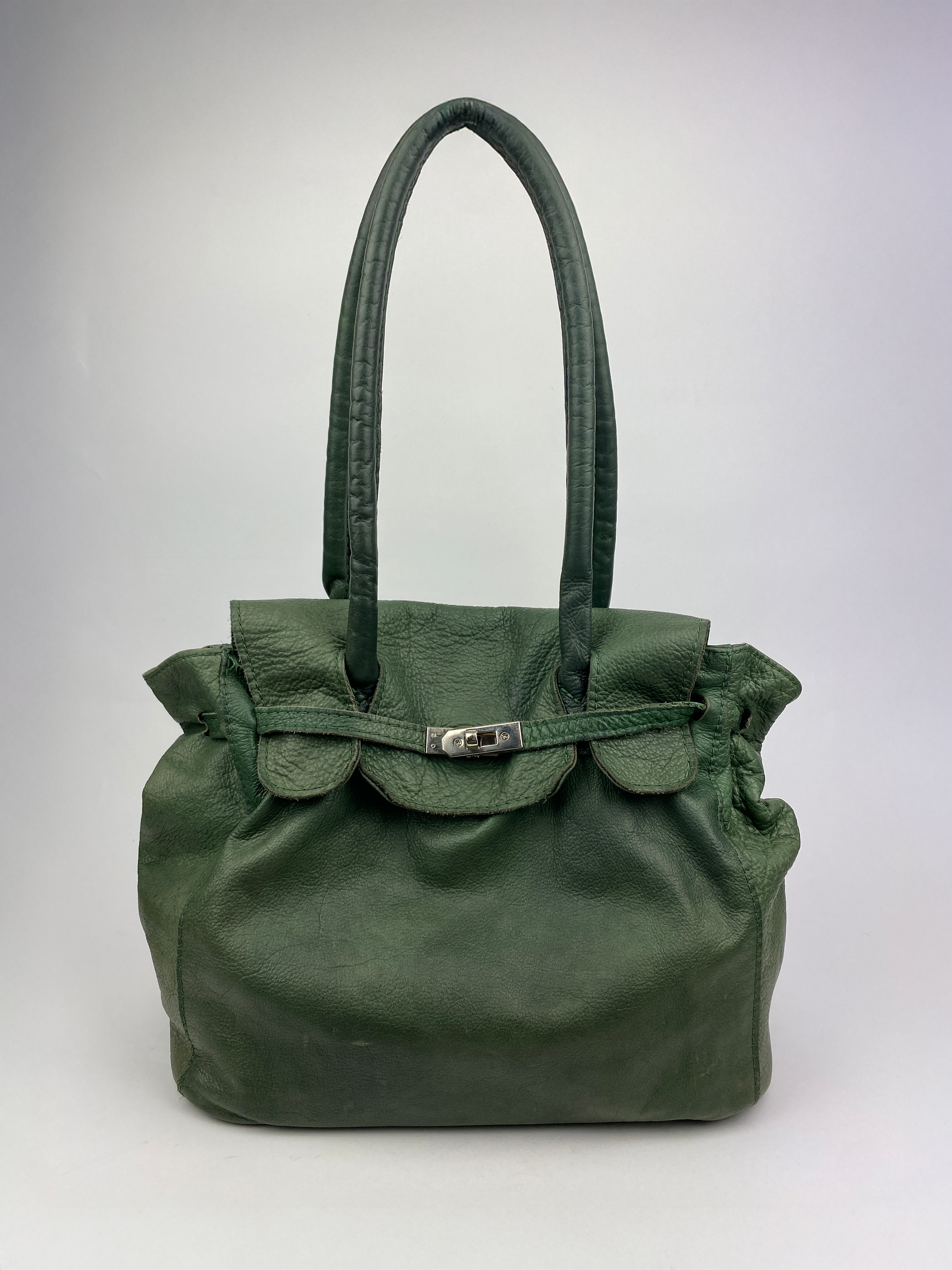Forest green shoulder leather bag with a classic Birkin-style silhouette. Features rounded top handles and a turn-lock closure. The leather has developed a beautiful patina.