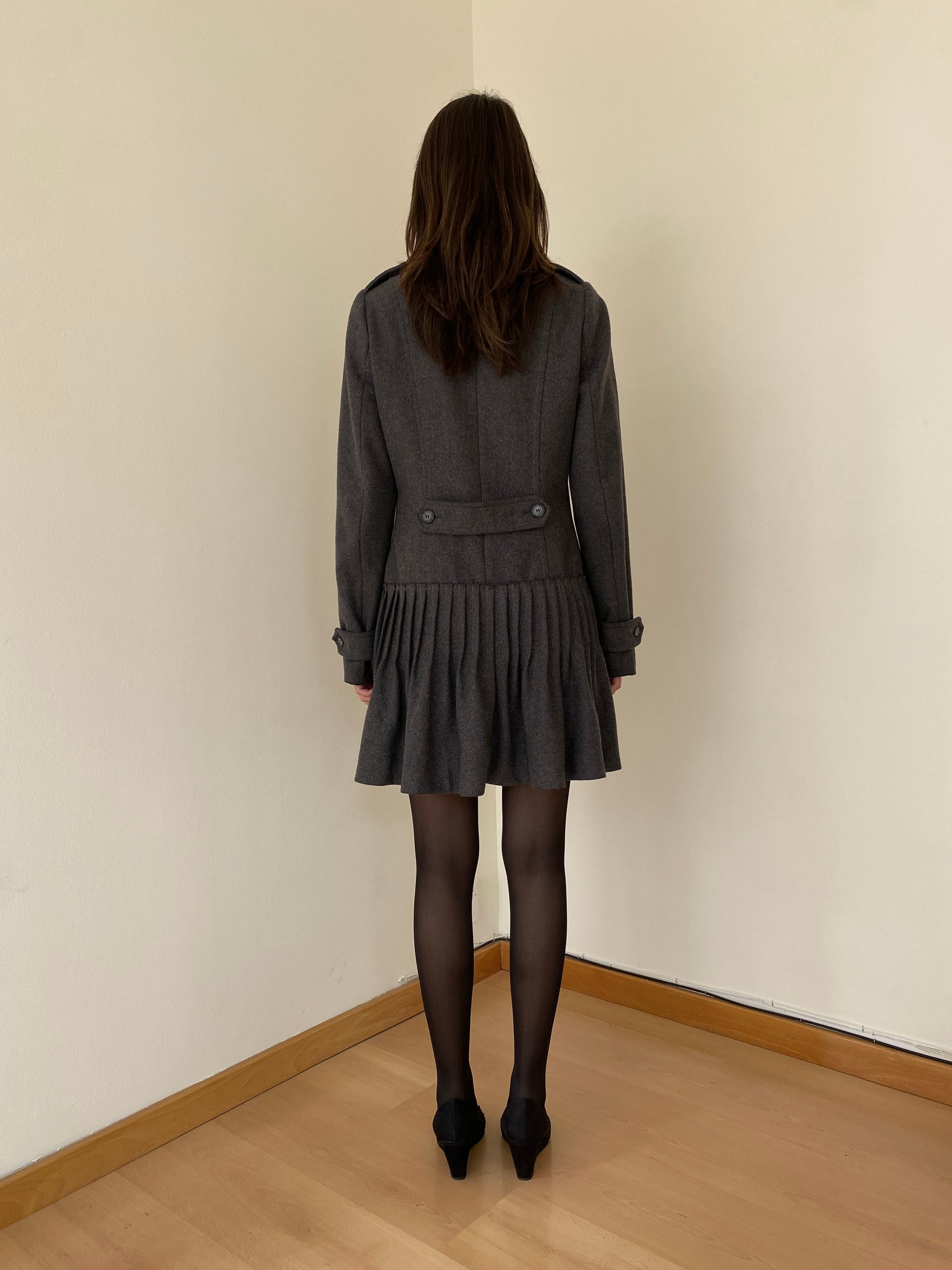 Max&Co grey double-breasted coat with structured shoulders, pointed collar, and low-waist pleated hem.