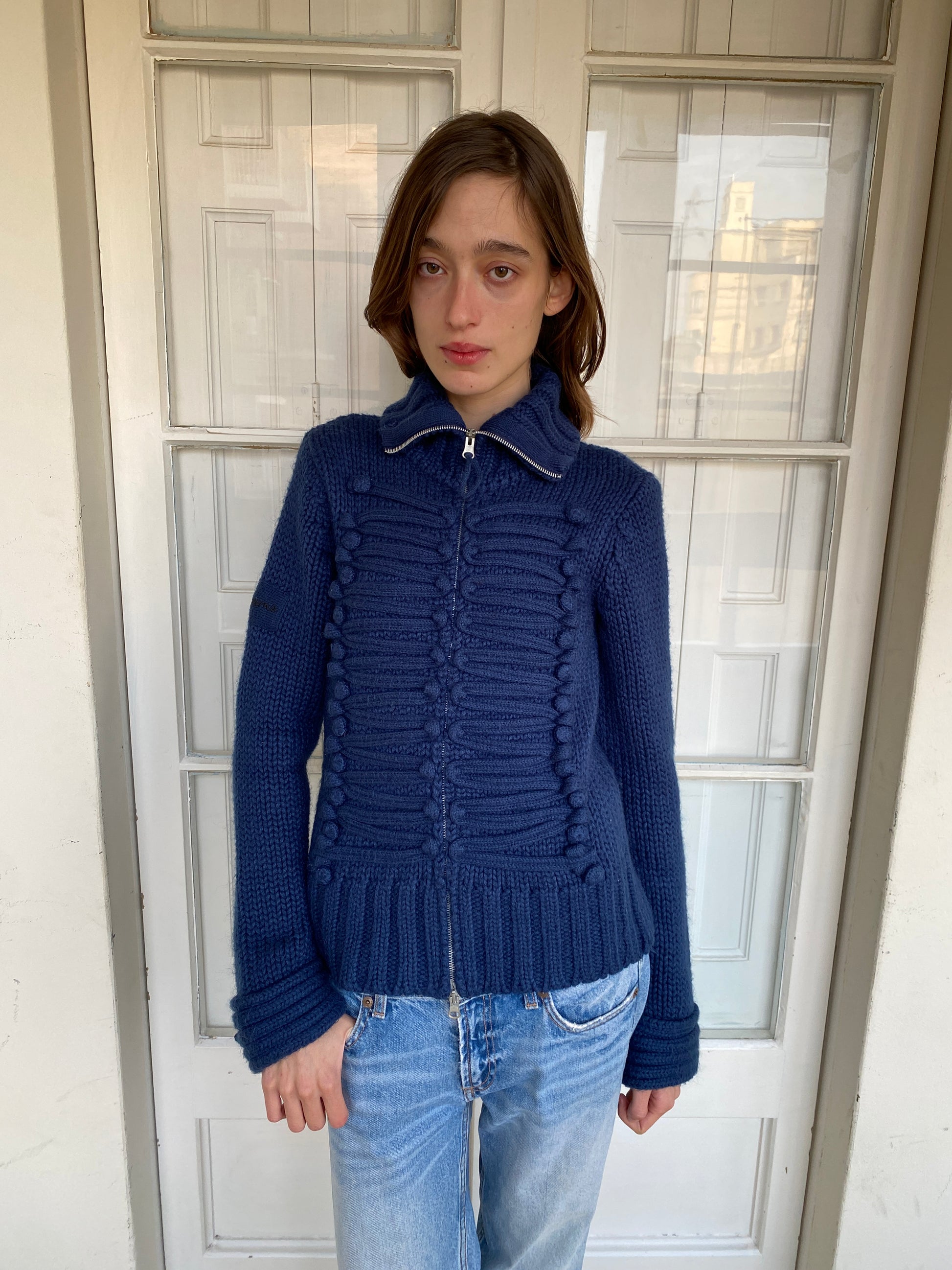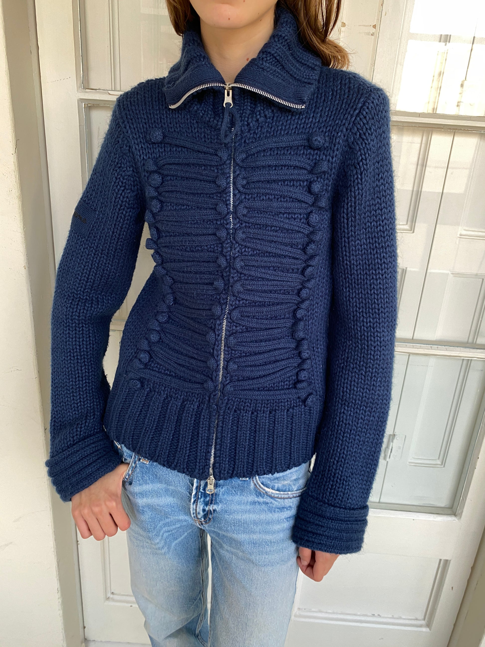 Chunky navy knit jacket with military parade inspired front detailing. Warm, structured fit.