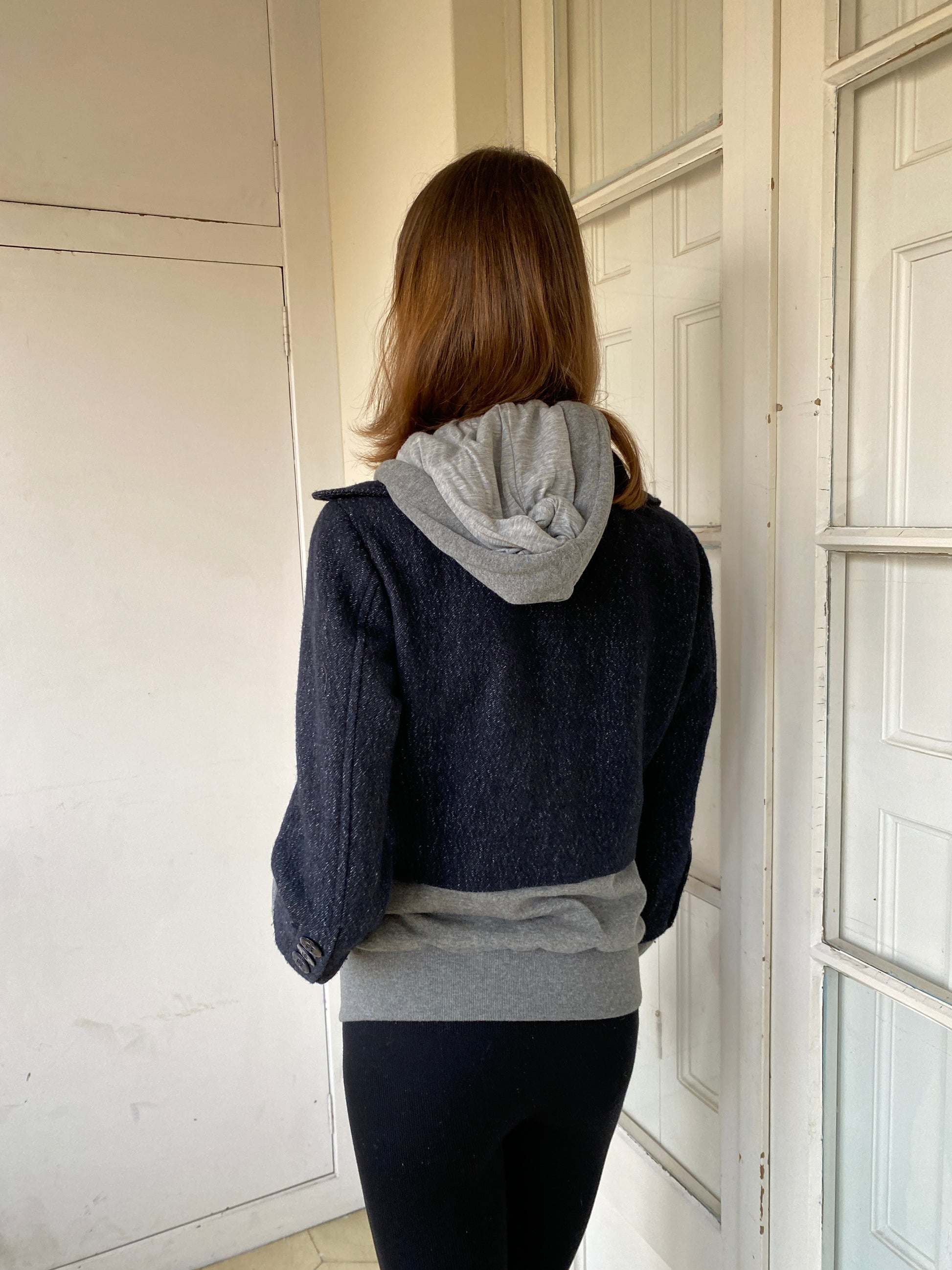 Italian designer jacket combining a navy peacoat-style upper with a grey hoodie and sweatshirt hem.