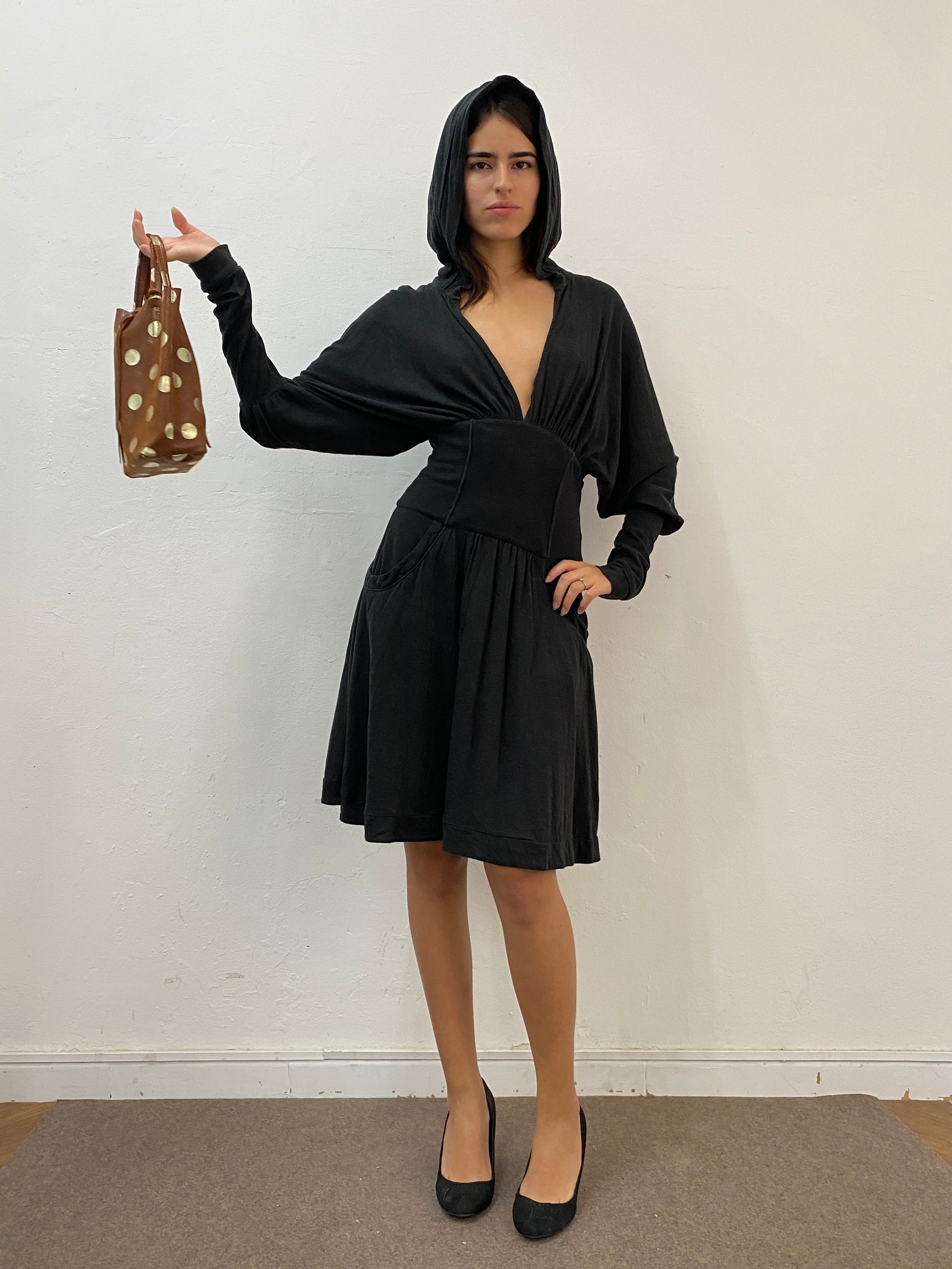 Draped black jersey dress with a deep neckline and structured hood. Fitted waist, voluminous skirt, and elongated sleeves create a bold yet refined silhouette.