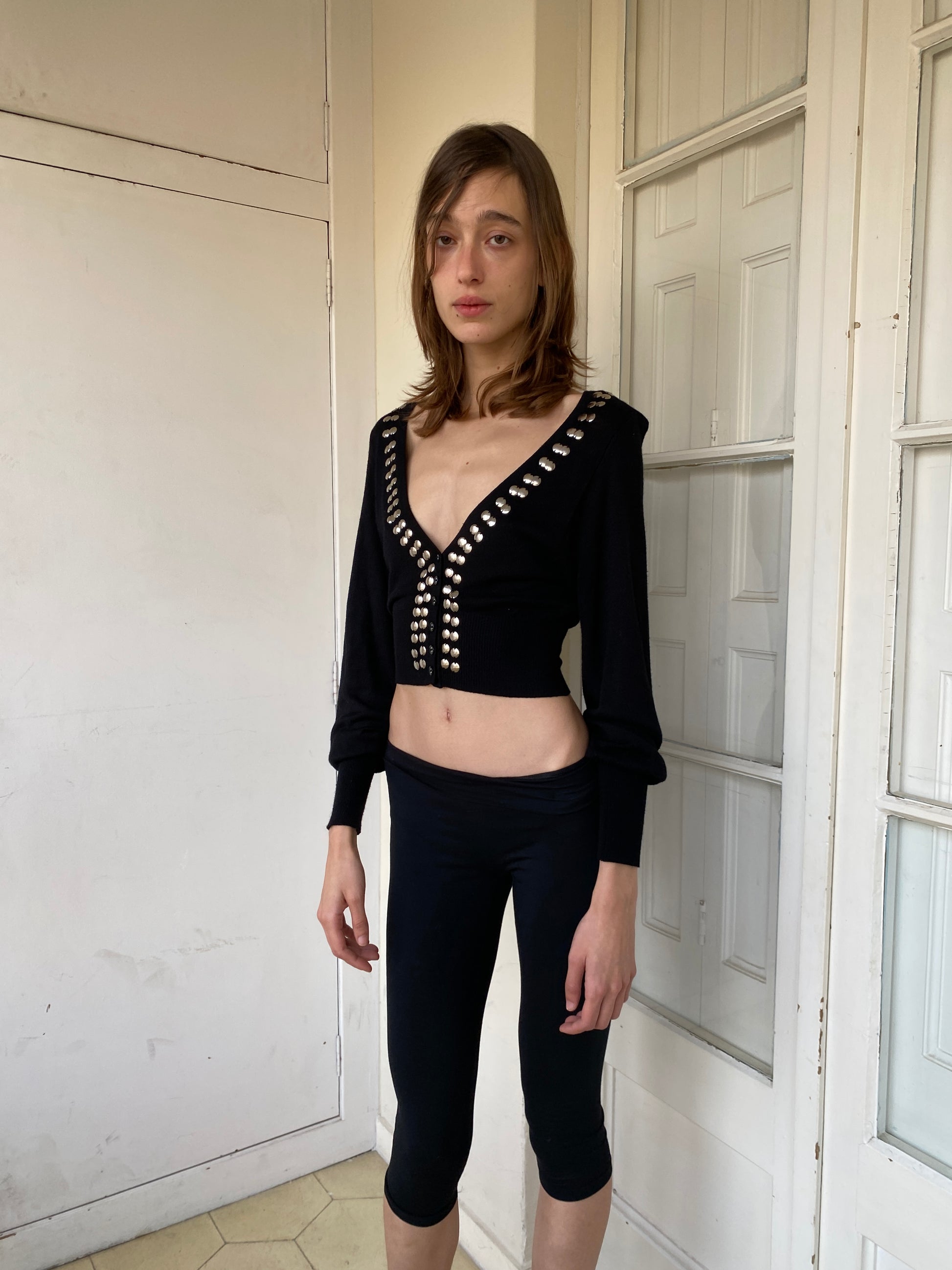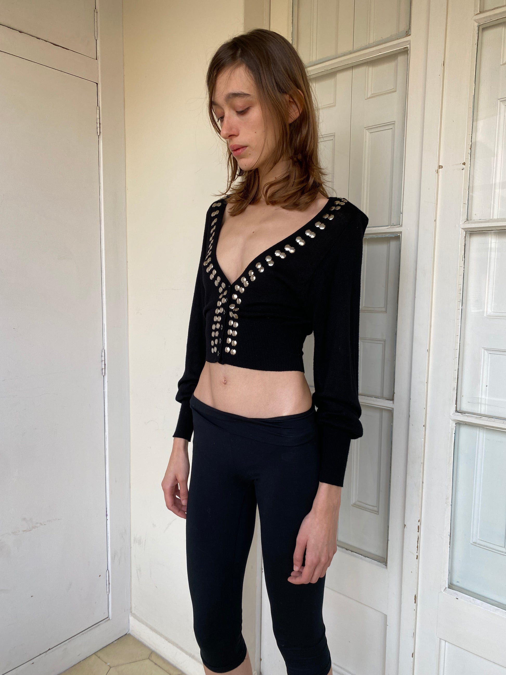 Cropped cardigan with deep V-neck and silver stud embellishments along the front. Slim fit with long sleeves and ribbed waist. Button-down closure.